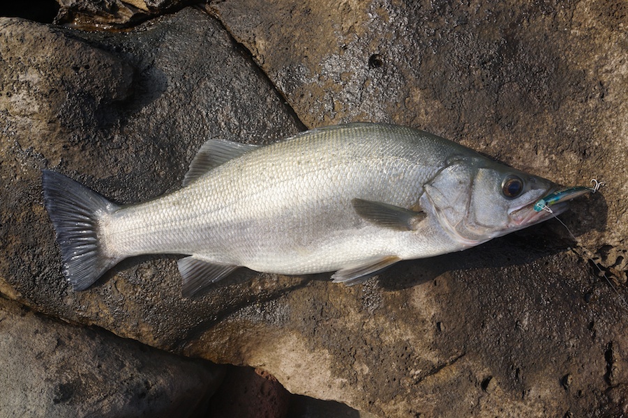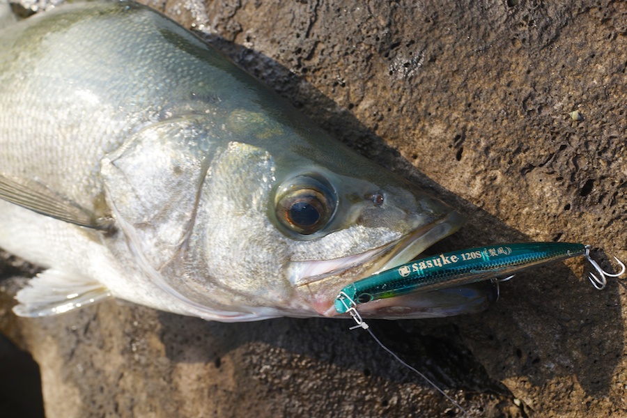 こういう時はそれはもうひたすら歩くしかない!というわけで、普段行かないような西目まで廻ってみたもののサラシは薄くなる一方でバイトすら得られない。そんな中、そろそろ折返しかな?ってとこで少し沖に潮目を発見。数投撃ち込むとついに来ましたよ!ドスンと!
