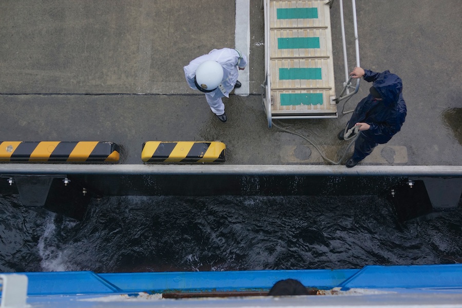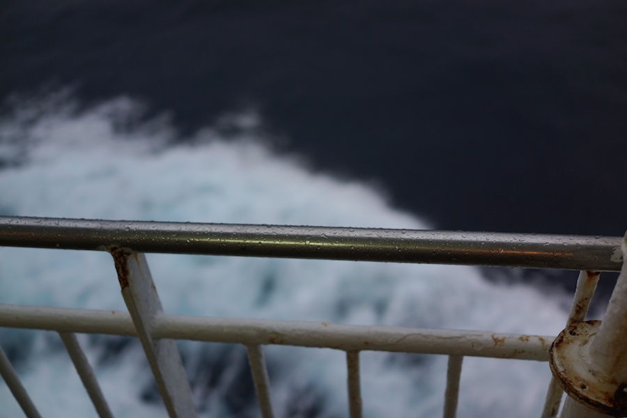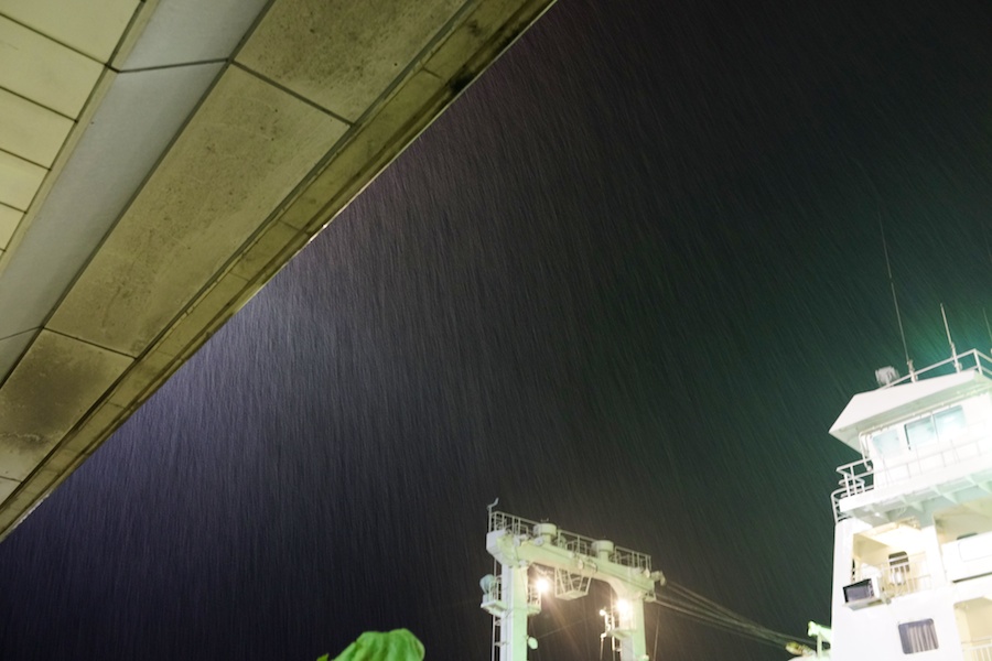 口之島入港のアナウンスで目が覚め、甲板に出ると湿気ムンムンの群青色の洋上。定番です。そして土砂降り。。。